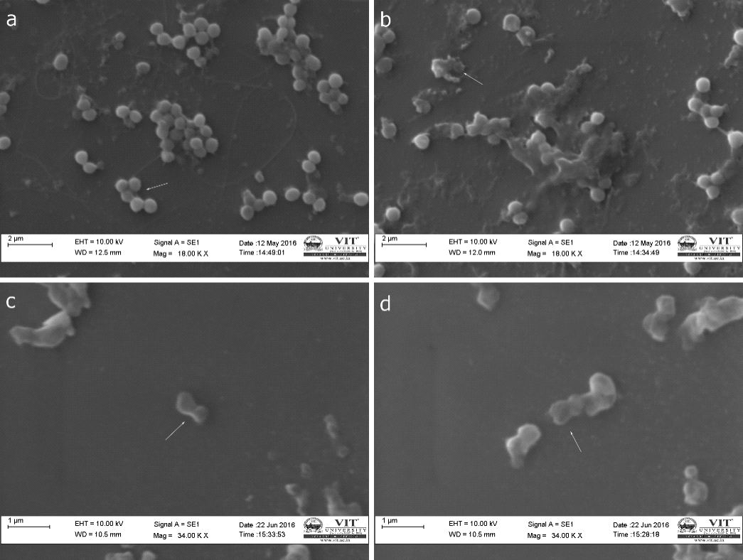 Visual assessment of cell damage to bacteria provides definitive evidence to the antibacterial activity of the ME formulation against pathogenic bacterial strains. Bacterial cells treated with LGME-AZM at 1x MIC demonstrated considerable morphological changes in the cell structure compared to the untreated bacterial strain observed under a scanning electron microscope (SEM). The treated cells of S. aureusand E. coli showed morphological changes in comparison to the untreated cells. The morphology of control cells of S. aureusand E. coli was smooth, with intact cell membrane (fig. 7a and 7c). After exposure to the optimized LGME-AZM, the cells were remarkably deteriorated, showing an irregularity in shape and structure of the cells (fig. 7b and 7d). This clearly explains the leakage of the cytoplasmic material of the bacterial cells. Tyagiet al. observed that E. colitreated with LG oil showed aggregation and deformities [45]. Korenblumet al.also stated that both LG oil and its major component, citral showed an immediate killing effect against sulfate reducing bacteria, suggesting that citral was responsible for the antibacterial activity of LG oil [46]. The SEM micrographs explains that the LGME-AZM formulation in comparison with the pure drug AZM has an enhanced antibacterial property against pathogenic bacterial strains.