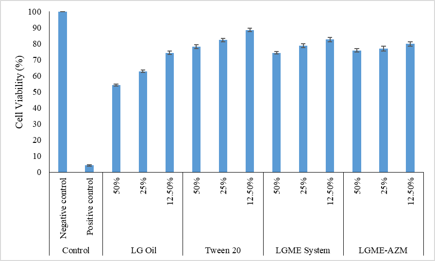 PBMC’s have a major role in human defense mechanism. They are nucleated cells, consist of lymphocytes and monocytes. The cultured lymphocytes were isolated to analyse the in vitro toxicity estimation of the prepared ME. The cytotoxicity of ME was interpreted by calculating the percentage of viable cells after interaction with the ME formulation and its individual components. The cytotoxicity of ME was illustrated by the decline in cellular viability of lymphocytes in a dose-dependent manner (fig. 8). The contact of ME with the human lymphocytes have the ability to impair the functional role of mitochondria,and the cytotoxicity was generally due to the initiation of cell death through the mitochondrial-dependent pathway [47]. The cytotoxicity study done on human lymphocytes displays that the ME at lower concentration (<25%) shows lesser toxicity to the cells compared to the higher concentrations, showing more than 50% of viable cells. This result confirms that the LG oil with acidic pH was not found to be highly toxic to lymphocytes at a lower concentration. In ME, an aqueous solution (water) takes the major portion with only 5% of LG oil. LGME-AZM prepared with the maximum solubility of the drug in LG oil,and the toxicity testing determines lesser toxicity compared to the control. This confirms the intake of LG oil based ME to be orally safe in ME form.