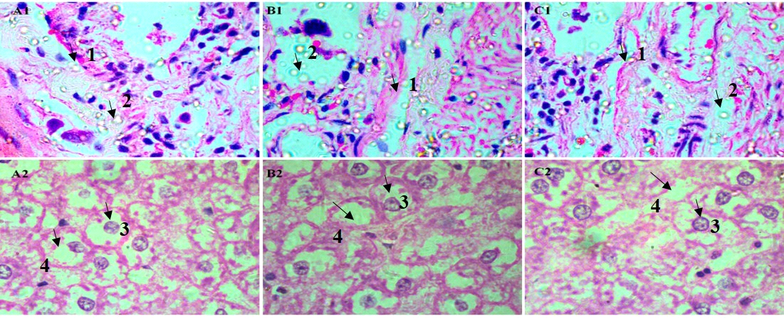 Fig.9: In vivo toxicity testing. HandE stained section of small intestine (Top) and liver (bottom) of three animal groups: Normal Controls treated with saline (A1, A2), dosage groups treated with LGME system (B1, B2), and dosage groups treated with LGME-AZM (C1, C2). (Magnification at 400X). Cellular morphology was observed with no abnormalities as marked: 1-Simple columnar epithelium, 2-Cytoplasm of goblet cells-mucin containing secretory vesicles, 3-Hepatocytes, 4-Central lobular vein