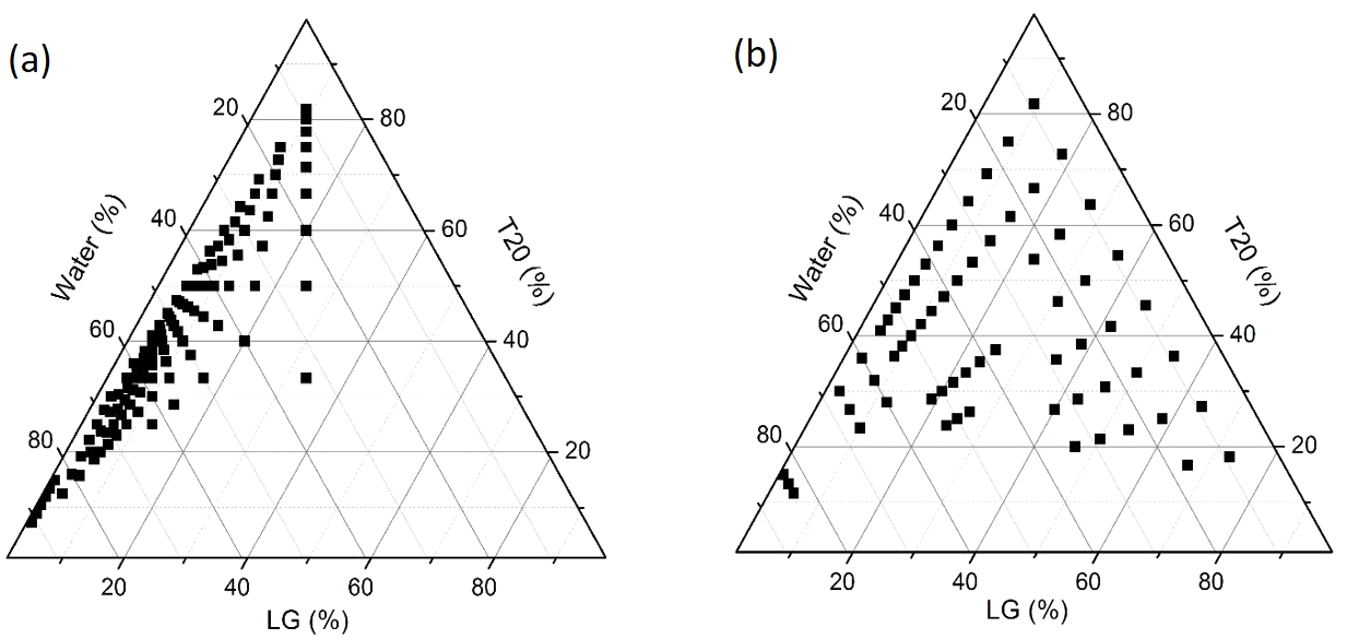 Fig.1: Pseudo-ternary phase diagrams done with lemongrass oil/tween 20/water. (a) ME transparent region between oil and surfactant ratio 1:1 to 1:9 (b) ME transparent region between oil and surfactant ratio 1:9 to 9:1