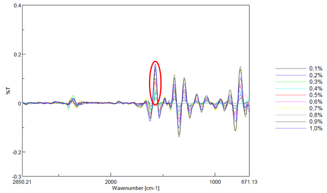 So practically, the development of the method was begun with determining the peak that can be used as a standard for the assay. First, standard spectrum measurements were performed at concentrations of 0.1 to 1%. The obtained transmittance spectrum was then converted to absorbance, which next was derived to determine the corresponding peak as the base for plotting calibration curve [32, 33]. From the overlaid spectrum as shown in fig. 2 below, it is found that peaks in the range of 1550-1605 cm-1 tend to be linear. This peak corresponds to the stretching of the C = O bond [23-25].