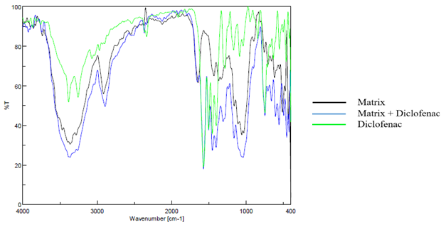 A series concentration of standard diclofenac was prepared in KBr IR spectra-grade with concentrations of 0.1% to 1.0% of 10 units. Each concentration was measured using FTIR, then the spectrum was derivatized. The AUC value of the selected peak is measured. A curve between standard concentration and AUC value was plotted. The acceptance criterion for linearity is the correlation coefficient ≥ 0.999 and coefficient of variance for regression function ≤ 2%.