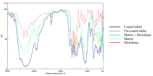 Fig. 4: Overlay of transmittance spectrum between the coated tablet sample with un-coated tablet, sodium diclofenac bulk, and the mixture of sodium diclofenac with matrix