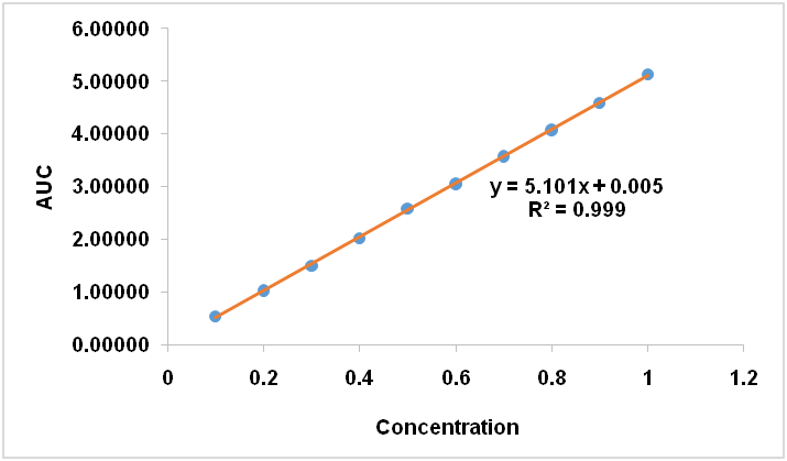 From test, a linear regression equation of diclofenac sodium was obtained (fig. 5). The regression equation was y = 5.101x+0.0051 with a correlation coefficient value equaled to 0.9998 and coefficient variance of regression function were 0.772%. It was concluded that the method has met the linearity criteria in the concentration range of 0.1% to 1% w/w.