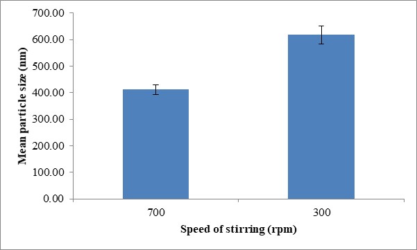 The effects of magnetic stirring speed on particle size, PDI and zeta potential are summarized in fig. 1 (A, B and C). As shown in fig. 1A, the particle size of CS-NPs decreased from 617.43 nm to 411.27 nm as the speed of stirring was increased from 300 rpm to 700 rpm at constant time of stirring. The size of particles is expected to reduce with increasing agitation [27]. Sufficient stirring can accelerate the dispersion of TPP in CS solution and the increased shear force helps to narrow size distribution [28]. 700 rpm speed of stirring was observed to improve mixing and create a more uniform environment for NPs formation, therefore contributing to a smaller average particles size.