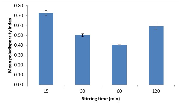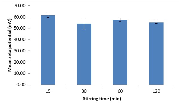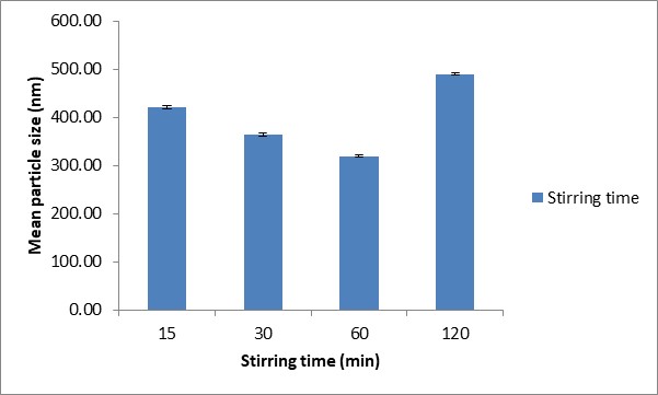 Stirring time has also been shown to have a significant effect on the particle size. The effect of stirring time on particle size was observed for four different durations of time; 15, 30, 60 and 120 min (fig. 2). The resulting data indicates the influence of stirring time, revealing a gradual decrease in the mean particle size from 421.60±3.47 to 319.30±2.31 nm, when stirring was increased from 15 to 60 min. This may be due to an improved dispersion of TPP in chitosan solution at longer stirring times, as the increased shear force helps to narrow the dispersity index. However, when the stirring time was increased to 120 min, the mean particle size of NPs was seen to increase to 489.70±1.71 nm. Nie and co-workers [29] demonstrated that an increase in the stirring time encourages agglomeration and particle growth, resulting in an increased mean particle size.