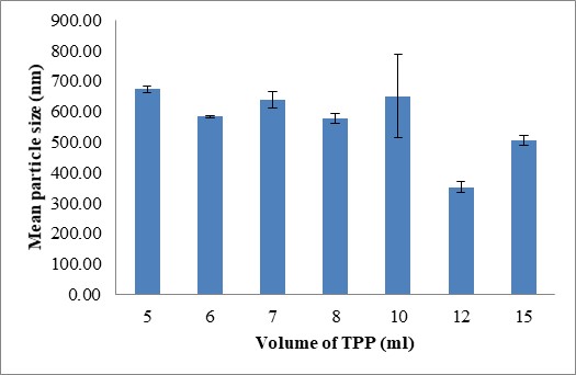The effects of different volume ratios of CS to TPP ranging from 25:5 to 25:15 on the physicochemical properties of CS-NPs are shown in fig. 3. When the volume ratio of CS/TPP was increased from 25:5 to 25:10, the particle size and PDI demonstrated an increase from 584 to 650 nm in size distribution and PDI in the range 0.6 to 0.8. This indicates a broader nanoparticle size distribution. One possible explanation is that lowering the TPP volume reduces the ability of the system to crosslink, thus lowering the number of nanoparticles produced. Particle size decreases to a value of 352.50 nm when the volume ratio of CS/TPP is increased to 25:12. This narrow particle size distribution suggests a better ionic interaction [30] between CS and TPP at this ratio, leading to an enhanced degree of cross-linking. The particle size was then shown to increase to 506.53 nm with increased in a volume ratio of CS/TPP to 25:15. At higher levels of TPP, a larger particle of nanoparticles was formed most likely due to the repulsion of charges since there were more cations available for reaction.