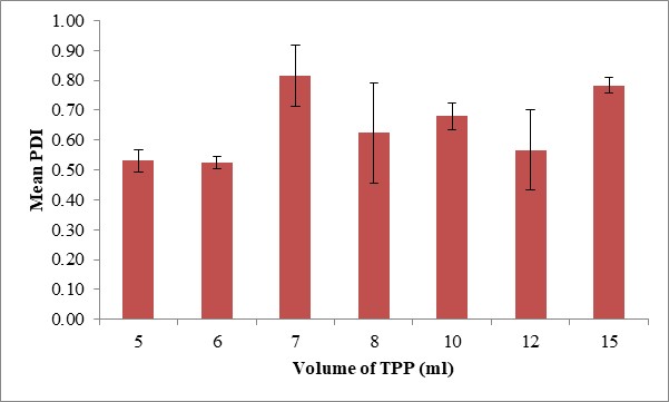 Fig. 3: Mean profile of effect of different volume of TPP added on physicochemical properties of CS-NPs. A. Effect on particle size; B. Effect on PDI; C. Effect on zeta potential. (mean±SD, n=3)