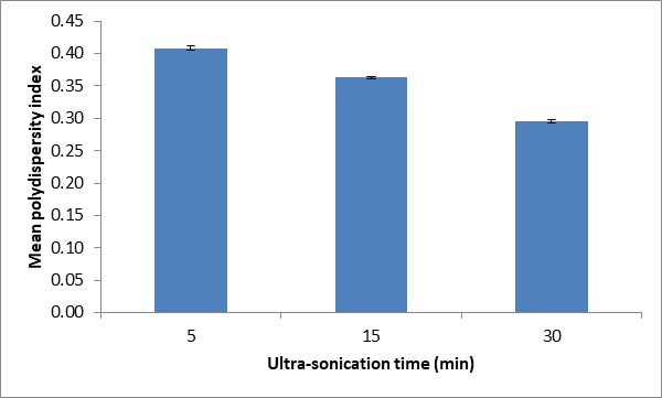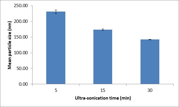 To investigate the influence of ultra-sonication on the physicochemical characteristics of NPs, the prepared CS-TPP-NPs dispersion was subjected to low-efficiency ultra-sonic processor over a series of time periods from 5 to 30 min. The resulting data (fig. 4) indicates a linear decrease in the average particle diameter of CS-TPP-NPs with increasing sonication time. The ultra-sonication process has been shown to reduce the average of particle size because it can break up the cluster formation of nanoparticles and help to scatter the nanoparticles into base fluids [31]. The mean diameter of dispersed NPs is reduced by approximately 50% after 30 min of ultra-sonication, from 231.30±5.80 to 142.20±0.61 nm. Moderate use of ultra-sonication could be able to reduce the particle size significantly via the disruption of particle aggregations, however, extensive ultra-sonication may cause severe fragmentation of the compact structure of the NPs subjected [28].