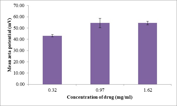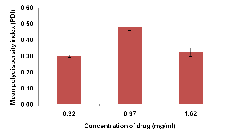 The effect of different caffeine concentrations on particle size and PDI are summarized in fig. 5. Different formulations of caffeine-loaded nanoparticles were prepared by adding a different amount of drug into TPP solution which was then added drop wised into the CS solution. After stirring, these solutions were subjected to ultrasonication for 15 min. As the concentration of caffeine was increased from 0.32 mg/ml to 0.97 mg/ml, the size of particles increased from 143.43 nm to 230.13 nm, indicating denser complexes forming at higher concentrations, due to the formation of larger self-assembled nanoparticles.