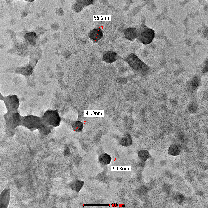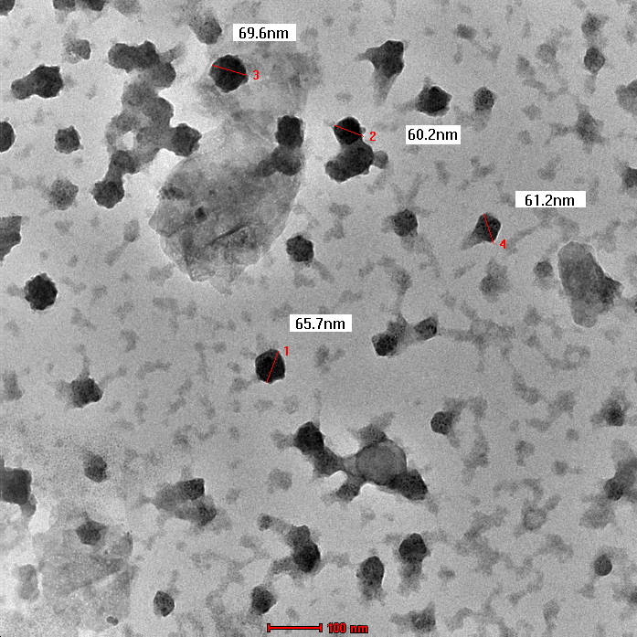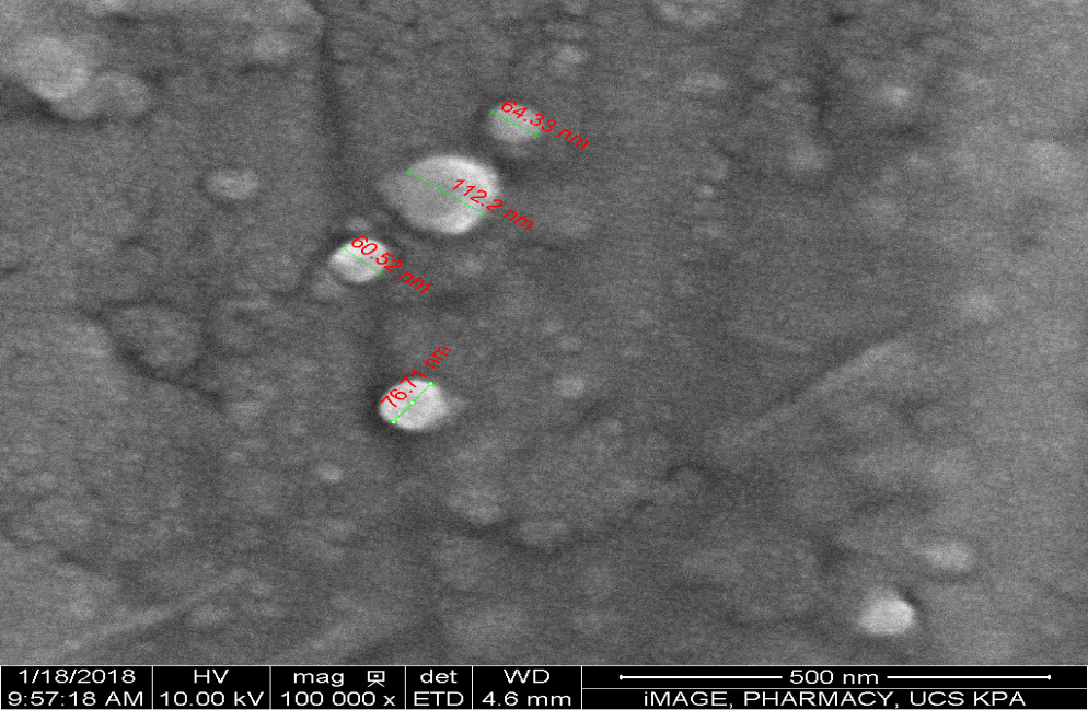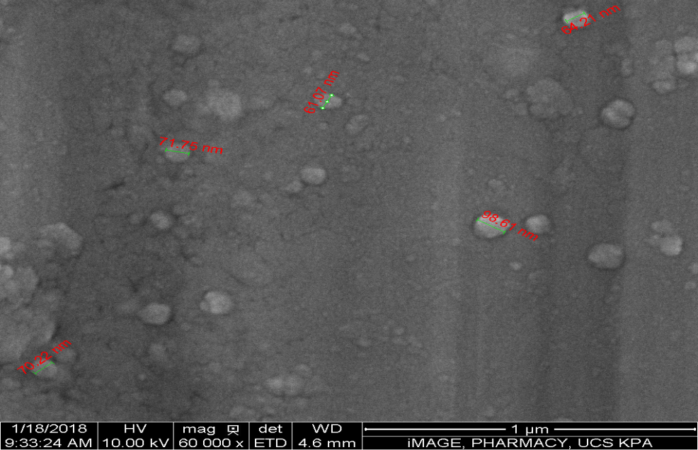 The morphological characteristics of caffeine-loaded CS-NPs were examined using SEM and TEM analysis and the results are shown in fig. 6 and 7, respectively. The results suggest that caffeine-loaded CS-NPs are relatively smooth and spherical with a diameter varying from 50-150 nm. All the NPs from SEM and TEM images were smaller than the hydrodynamic sizes determined by light scattering because of the drying and vacuum process. The variable morphology of caffeine-loaded CS-NPs may be attributed to the variation in the inter-or intra-particulate interaction of caffeine-loaded CS-NPs, may contribute to this morphological diversity. Both TEM and SEM micrographs revealed that some particle aggregation may be due to the freezing and drying stress from the freeze-drying process, and this aggregation contributes to the mean particle size [34, 36, 40].