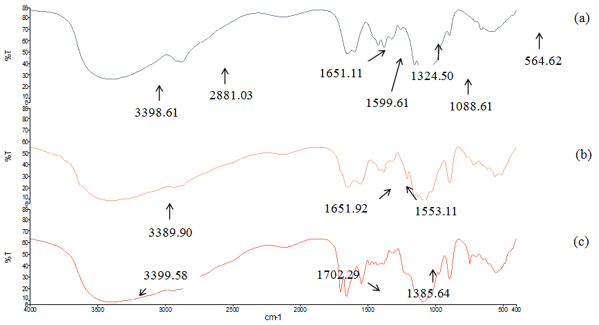 Fig. 8: FT-IR spectra of (a) CS, (b) unloaded CS-NPs, and (c) caffeine-loaded CS-NPs