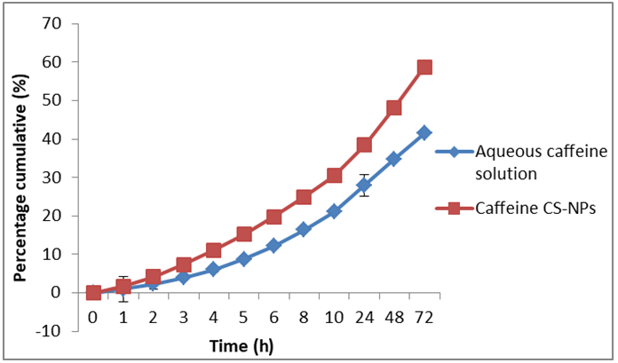 The in vitro cumulative release profiles of caffeine from CS-NPs and aqueous solution of drug (control formulation) in PBS solution (pH 7.4) are depicted in fig. 10. There is an increment of drug release for both formulations within the 72 h duration of the study. Both formulations showed sustained release of caffeine throughout the 72 h duration. However, the release of caffeine from CS-NPs was significantly (p<0.001, paired t-test) higher compared to the release of caffeine from control formulation. Within the first 8 h of study, caffeine released was 24.9% and 16.3% from CS-NPs and the control formulation respectively. At the end of 72 h, approximately, 58.7% of caffeine was released from CS-NPs and 41.5% of caffeine was released from the control formulation. Caffeine-loaded in CS-NPs with a smaller size possess a greater surface-to-volume ratio, resulting in a higher released and penetration compared to caffeine in aqueous solution. In addition, drug release is less rapid in amorphous nanoparticles than in crystalline particles. Lack of crystallinity suggests better drug dispersion and increased drug–matrix interactions, leading to the conclusion that if slower release kinetics are required, reduced crystallinity is favoured [37].