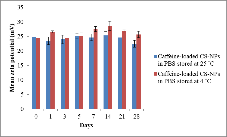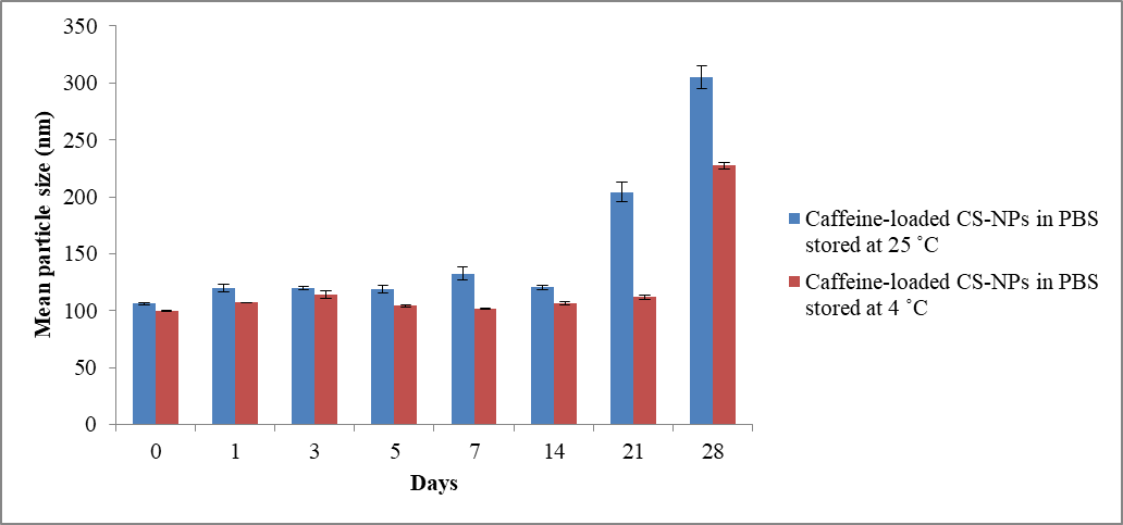 A standard amount of nanoparticles was suspended in PBS solution (pH 7.4) and stirred for 1 hour. All samples was placed in a tube and covered with aluminum foil. Each sample of caffeine loaded CS-NPs were kept separately at 4 ⁰C and 25 ⁰C for 28 d. Samples were analyzed at predetermined time intervals of 0, 1, 3, 5 d and the every week after for up to one month. For each time interval, the average size, PdI and zeta potential of the sample were measured.