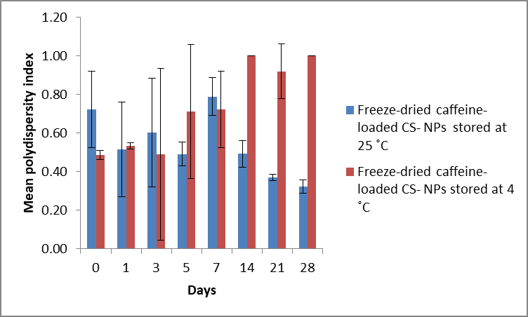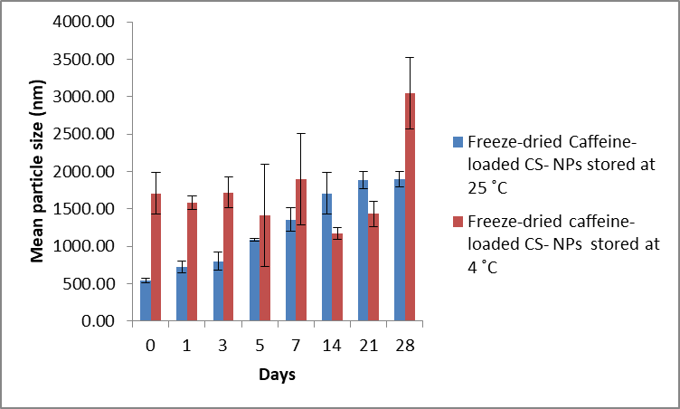 Stability studies of caffeine-loaded CS-NPs in freeze-dried form were also conducted at both temperatures for 28 d. The results are shown in fig. 12. The mean particle size of caffeine-loaded CS-NPs shows much greater values, above 1000 nm. Freezing exerts a substantial destabilizing stress on nanoparticles resulting in two phases of separation; one which contains ice and another concentrated viscous phase containing the nanostructures and other formulation constituents. This high particulate concentration, together with the ice crystals, may lead to aggregation, and in some cases, an irreversible fusion of nanoparticles [38, 39].