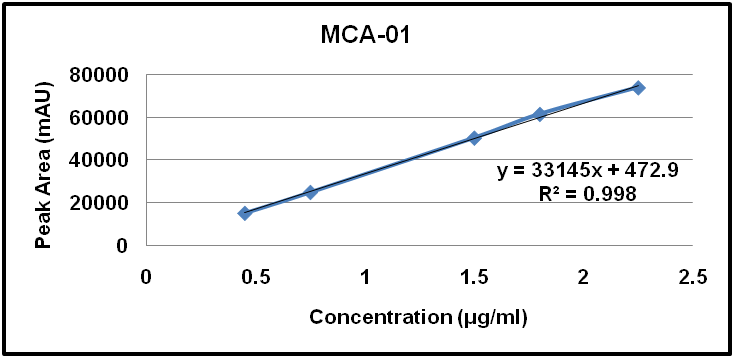 The linearity of this method was evaluated by linear regression analysis and calculated by a least square method and studied by preparing stock solutions of MCA-01, MCA-02 and Degradation impurities at different concentration levels.