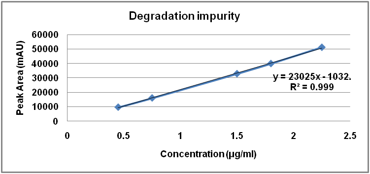The calibration curve showed good linearity in the range of 0.45-2.25μg/ml. Generate linearity plot of area versus percentage of concentration. Linearity curve it should be more than 0.998 that shows linear detector response. The results are given in table 4.