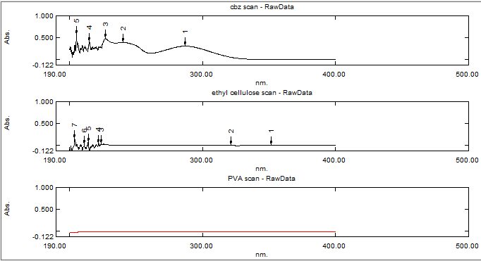 Fig. 1: UV-spectrum of carbamazepine (cbz), ethyl cellulose and polyvinyl alcohol (PVA)