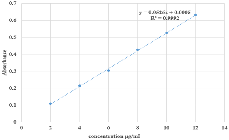 Linearity was evaluated with six different concentrations ranged from 2-12 μg/ml which obtained by diluting of carbamazepine (CBZ) stock solution with distilled water. The linearity of CBZ equation was used to calculate CBZ in the fabricated microparticles [19].