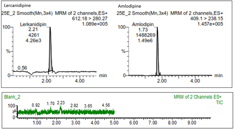 The result showed that no carry over in plasma blanks after injection of the highest concentration (ULOQ) lercanidipine. The carryover percentage still meets the requirements for analytes<20% and<5% for the internal standard. The result can be seen in table 1.