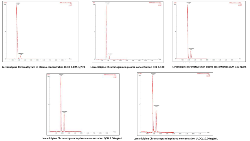 Lercanidipine is effective for the treatment of patients with mild to moderate hypertension without affecting heart rate [1]. As an antihypertensive derivative of calcium channel blockers used in serious conditions, lercanidipine is included on the bioequivalence test mandatory drug list [2]. Implementation of bioequivalence tests must be using validated bioanalysis methods [3] therefore a reliable, rapid, and highly sensitive bioanalytical measurement technique for plasma drug measurement is required.