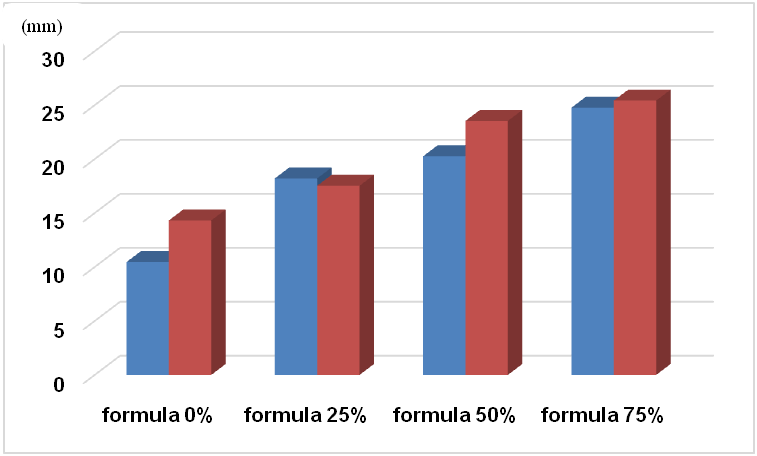 Anti-acne activity of all formula gels indicated that C. aurantifolia in gel preparation was more effective as anti-acne against both tested bacteria, than its pure fruit juice. The details of the inhibition were performed in table 7. All formulas resulted in higher inhibitory diameter against P. acne than to S. epidermidis. This was very interesting, considering that the main pathogen of acne was caused by P. acne and the P. acne was sensitive to all formulas gel containing C. aurantifolia fruit juice. But the more increasing juice concentration exhibited the more diameter of inhibition zone against both of tested bacteria. Thus, the formula 3 gave the highest anti-acne activity against P. acne and S. epidermidis. This result can be clearly seen in fig. 1.