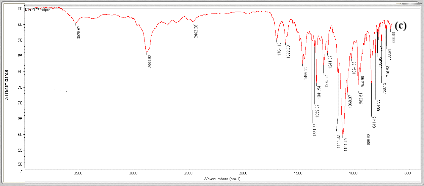 FTIR results showed no detected chemical interaction between ciprofloxacin HCl and P407. Fig. 2 shows that there were no extra peaks appearing and no noticed shift in peaks when comparing the IR chart of ciprofloxacin alone (fig. 2, a), the IR chart of poloxamer alone (fig. 2, b) with the IR chart of the physical mixture of ciprofloxacin HCl and P407 (fig. 2, c).