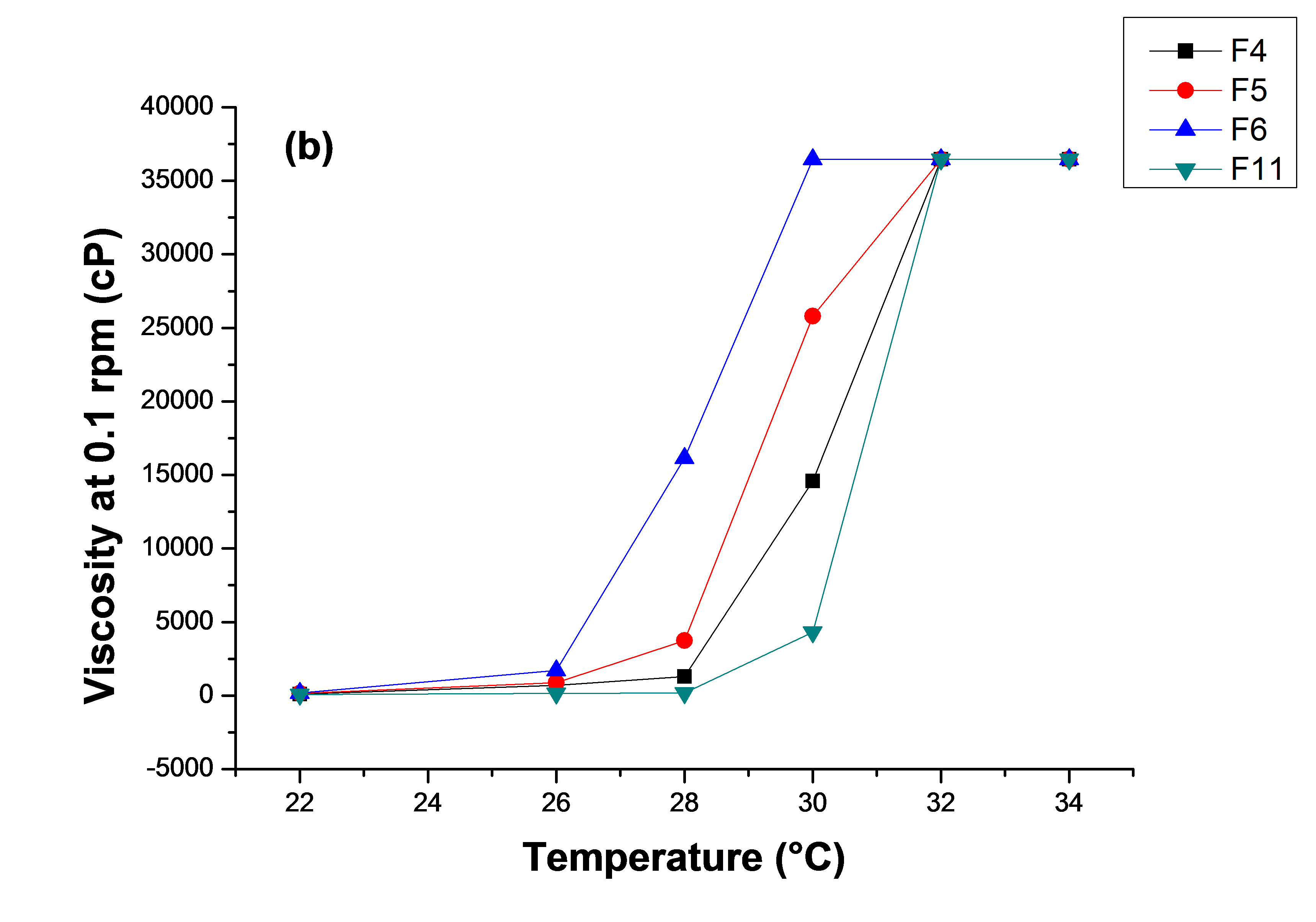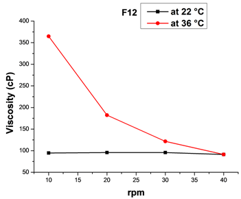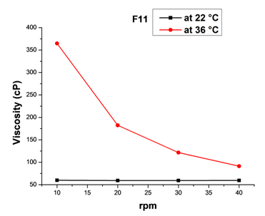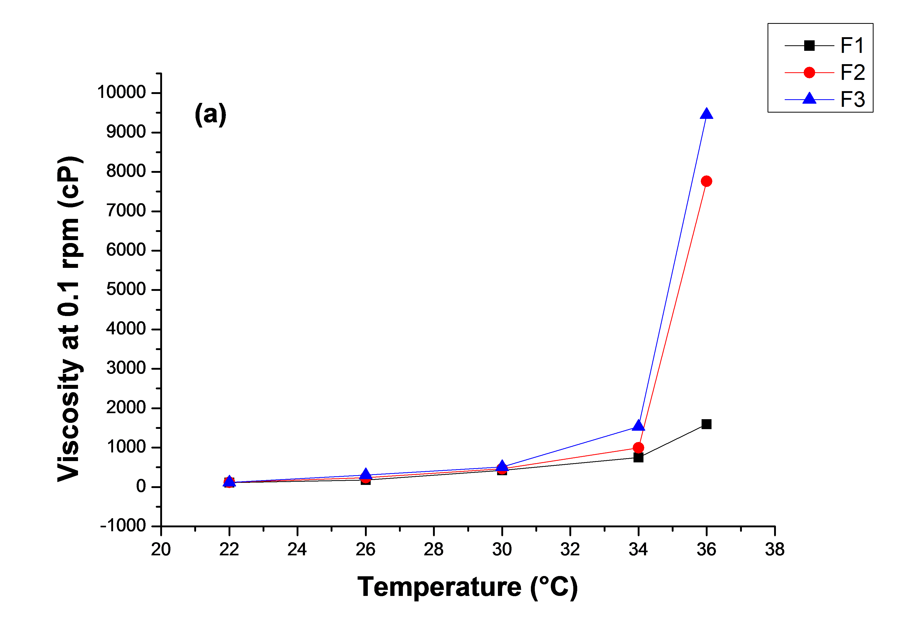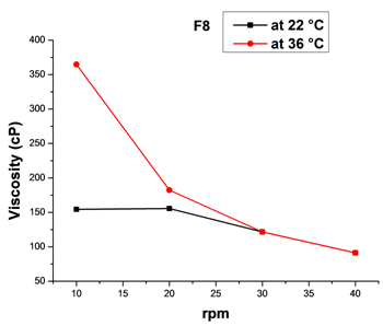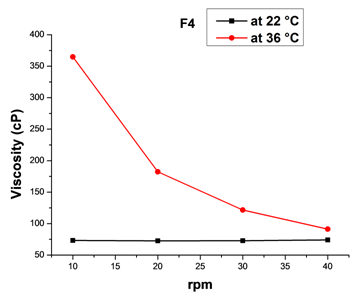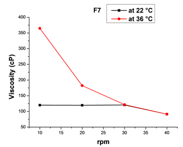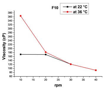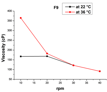 It is worthy to note that F8, F9, and F10 showed non-Newtonian behavior at both physiological and non-physiological conditions. This might be due to the relatively high concentration of P407 used in these formulas. Varshosaz et al. found that increasing in the concentration of P407 up to 30% lead to gels display a non-Newtonian behavior at both non-physiological and physiological environments [31].