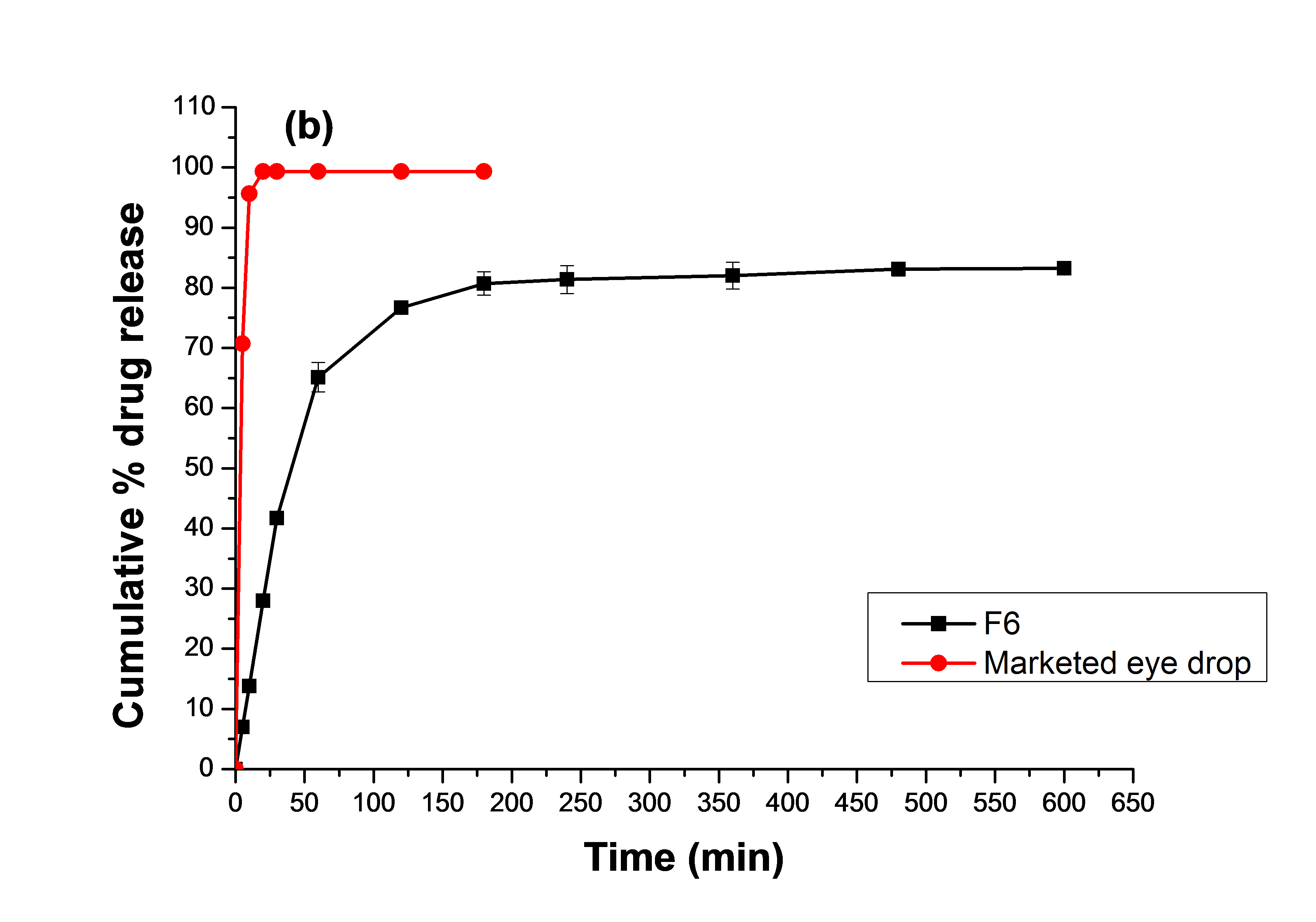 Fig. 8b shows that in comparison to the marketed eye drop solution, where almost all the ciprofloxacin HCl was released immediately within 10 min, the selected formula (F6) manifested prolonged release. This result indicates that in-situ gel formulation has prolonged-release effect in vitro in comparison to the low bioavailable, marketed formulation of ciprofloxacin eye drop.