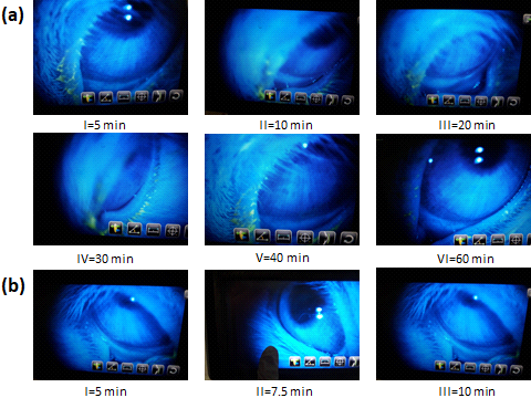 Fig. 9: In vivo elimination study, fluorescein sodium salt was dispersed in the preparations and visualized using an auto-refractometer. One drop of each preparation was added into the lower conjunctival sac of rabbit, an auto-refractometer with blue light was used to monitor and photograph the disappearance of the fluorescein sodium salt. (a) Elimination time after the in-situ gel was dropped. (I–VI: 5, 10, 20, 30, 40, 60 min). (b) Elimination time after the control marketed eye drop was dropped. (I–III: 5, 7.5, 10 min). n=3