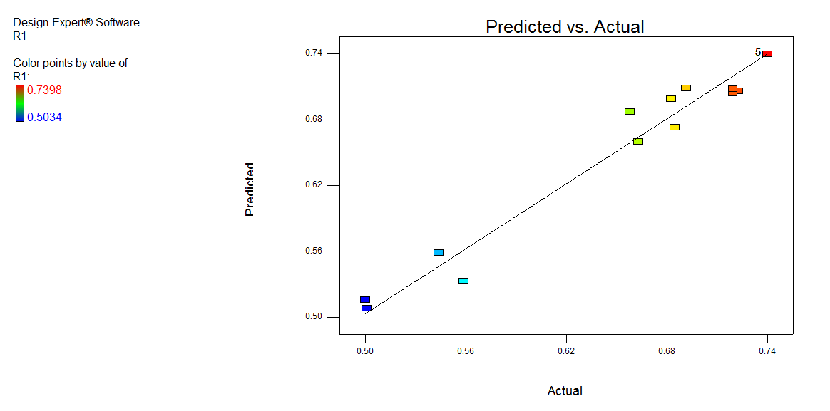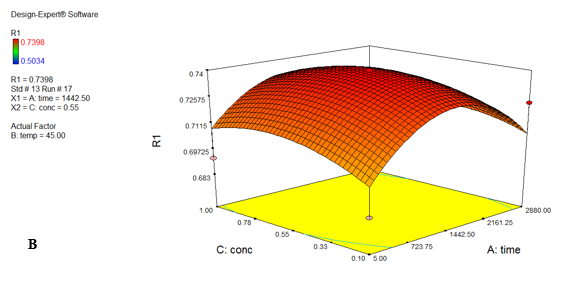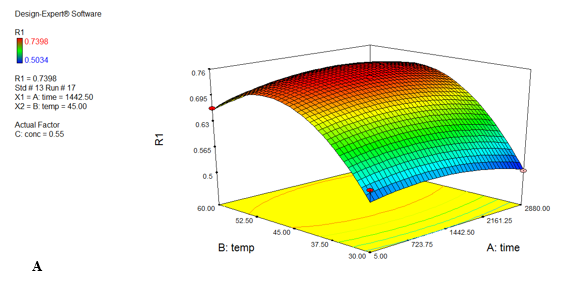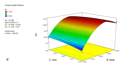 The optimal conditions for the synthesis of AgNPs were carried out by Response surface methodology (RSM) integrated with Box Behnken Design (BBD) using Design Expert software (7.0.0 trial version). A total of 17 runs were experimentally conducted for the process parameters Silver nitrate (AgNO3) concentration (mM), temperature (°C) and incubation time (min). The output responses observed through experiments was in close fit with the model predicted values (fig. 2). Also, p-value Prob>F (0.0001) in ANOVA represents that the model is significant. Using Design expert, the 3D plots (fig. 3a, 3b, 3c) generated predicted the optimal conditions at the maximum absorbance (0.7398) to be 0.55 mmol AgNO3 concentration, 45 °C and 1442.50 min (24 h).