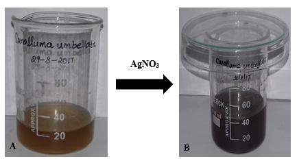 Silver nitrate (AgNO3) from Fisher Scientific was used. Stems of Caralluma umbellata (AKAJ/MK101/09/2017) was collected in 12.1899 ° N, 79.9249 ° E, Auroville women’s nursery (Marakkanam). Nutrient agar, Potato dextrose agar, antibiotic tetracycline and fluconazole, microbial strains E. coli, B. subtilis and A. niger.