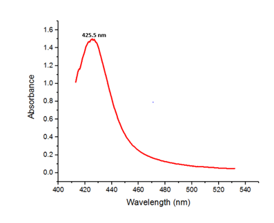 The AgNPs synthesized from the Cu-SE can be observed visually by the colour change of the extract from yellow (fig. 4a) to dark brown (fig. 4b) on the addition of aqueous silver nitrate (AgNO3) solution. The reduction of Ag+ions to Ag ° ions by the phytochemicals present in the Cu-SE was initially analyzed by UV-Visible spectroscopy with the absorbance band near 425.5 nm (fig. 5).