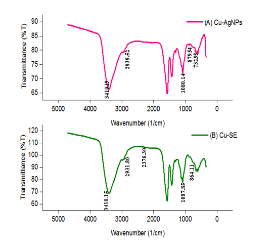 Fig. 8: FTIR peaks showing (A) functional groups of Cu-AgNPs (B) functional groups of Cu-SE