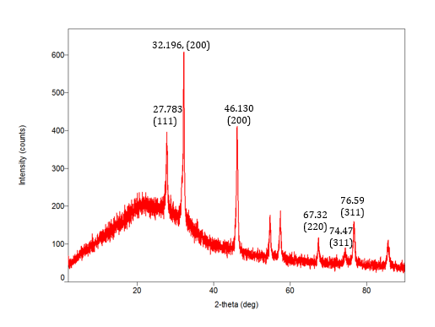 The diffraction peaks at 2θ values 27.783°, 32.196°, 46.130°, 67.32°, 74.47° and 76.59° in the experimental diffractogram obtained through XRD have been identified to be due to the presence of noble metal silver in the sample and the corresponding hkl values are (111), (200), (200), (220), (311) and (311) respectively (fig. 9). All the peaks represent the Face-centered cubic (FCC) structure of the silver element. The average crystalline size ‘D’ of AgNPs was calculated by Debye-Scherrer formula and was found to be 26 nm and the average lattice constant of AgNPs is 4.5535 Å [19].
