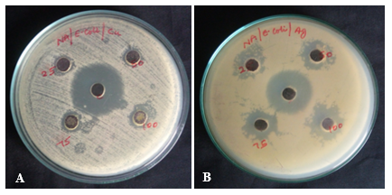 Fig. 11: Antibacterial activity against gram negative E. coli when treated with (A) Cu-SE (B) Cu-AgNPs