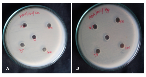 The bacterial and fungal strains were obtained from The Institute of Microbial Technology, Chandigarh, India. The antibacterial activity was analysed for the Cu-SE and Cu-AgNPs against gram positive Bacillus subtilis (MTCC 441) and gram negative Escherichia coli (MTCC 739). Well, diffusion assay was prepared by making 5 wells in the solidified nutrient agar swabbed with 24 h grown culture. With tetracycline as a positive control in the middle well and different concentrations of the test samples (250 µg/ml, 500 µg/ml, 750 µg/ml, 1000 µg/ml) were loaded to the four surrounding wells and incubated at 37 °C for 24 h. The inhibition zone diameter was measured after incubation to understand its inhibitory action [8].