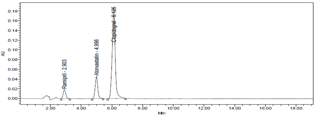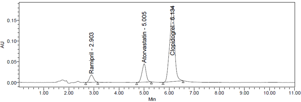 Six trials were performed for the method development and the best peaks with least fronting factor was elevated for ramipril, atorvastatin and clopidogrel to be with retention times were 2.903, 5.005, 6.134 min respectively. The resultant chromatogram revealed in the fig. 2.