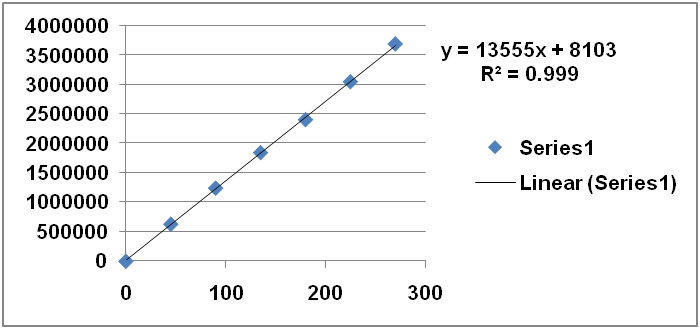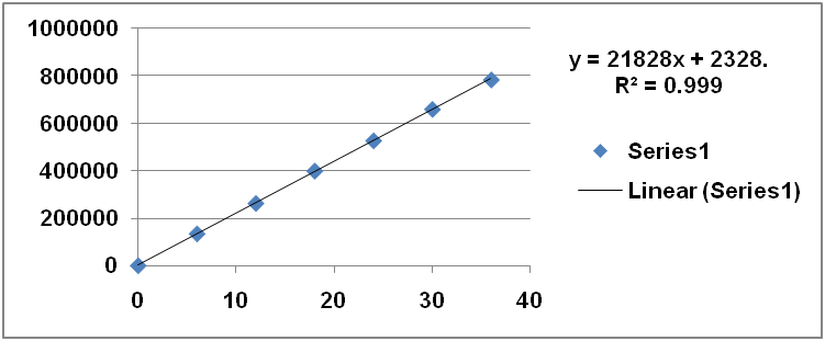 Fig. 5: Linearity graph for clopidogrel, X-Axis = Concentration, Y-Axis = peak area