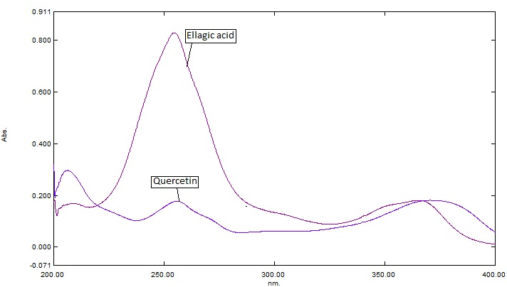 Suitable wavelength for the HPLC analysis was determined by recording UV spectrums in the range of 200-400 nm for individual drug solutions of ellagic acid and quercetin then overlapped. UV overlain spectra of these two markers showed that the drugs absorb appreciably at 255 nm and hence 255 nm was taken as a detection wavelength for HPLC analysis (fig. 1).