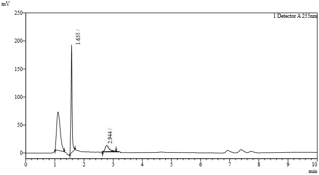 The method was developed using reverse phase, shim-pack HPLC C18 column (250 X 4.6 mm, 5 µm). The run time was of 10 min. The mobile phase used was 0.02 M potassium dihydrogen orthophosphate buffer (pH adjusted to 3.5 with orthophosphoric acid) and acetonitrile in the ratio 60:40 at a flow rate of 1.2 ml/min, column temperature maintained at 35 °C and a detection wavelength of 255 nm using a UV-visible detector.