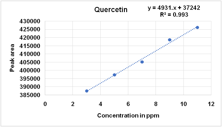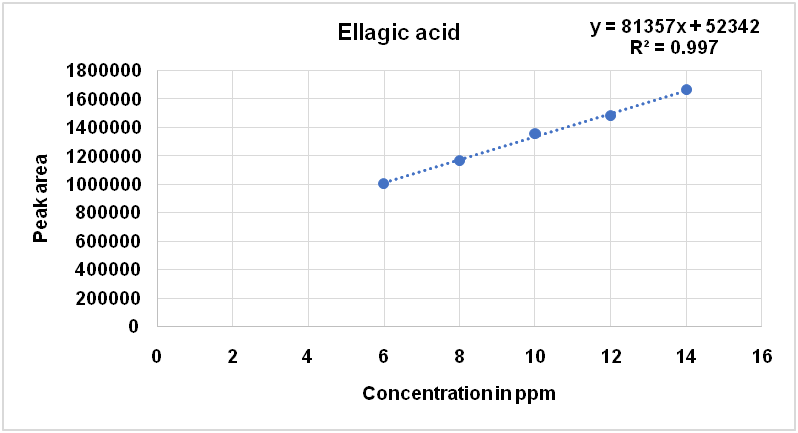 Standard solutions of ellagic acid and quercetin at different concentrations level were prepared in triplicates. Calibration curves were constructed by plotting the concentration level versus corresponding peak areas for each marker. The results show an excellent correlation between peak areas and concentrations level within the tested concentration range of 6-14 ppm for ellagic acid and as that of 3-11 ppm for quercetin (table 5). The correlation coefficients were greater than 0.99 for each marker, which meet the method validation acceptance criteria [13, 14] and hence the method is said to be linear (fig. 5, 6).