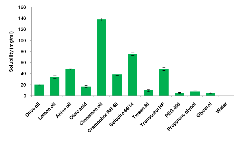 The drug-loading capacity of the SEDDS formulations depends on the solubility of TLS in the various vehicles of the system, which was determined by solubility studies. The results are presented in fig. 1.