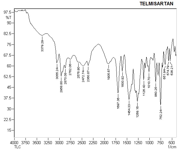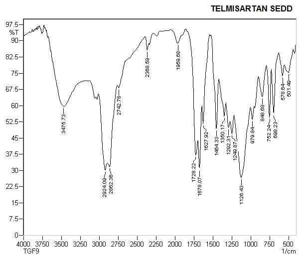 FTIR spectra of telmisartan (fig. 2) showed characteristic peaks of aliphatic C-H stretching at 2958 cm-1, C=O stretching at 1697 cm-1, C-N stretching at 1126 cm-1, C=N stretching at 1600 cm-1. The FTIR spectra of SEDDS (fig. 3) also showed all these characteristic peaks with minor shifts. These results from FTIR spectral analysis indicated that there was no chemical interaction between drug and excipients used in the formulation.