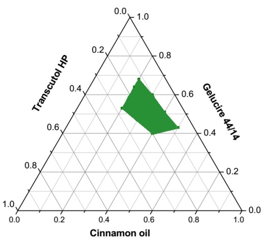 A ternary phase diagram was investigated for the prepared formulations. Before the construction of ternary phase diagrams, the miscibility between surfactants and oils was investigated to select the best components. The mixture of surfactant Gelucire 44/14 and cinnamon essential oil resulted in clear solutions. Formation of emulsion systems (the green area in fig. 4) was observed at ambient temperature.