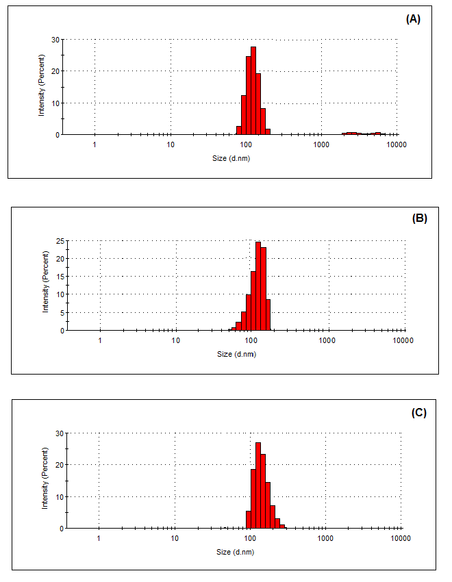 Fig. 7: Particle size distributions of the micro emulsions generated from Formulation TF9 in (A): enzyme free simulated gastric fluid (pH 1.2), (B): enzyme free simulated intestinal fluid (pH 6.8) and (C): distilled water