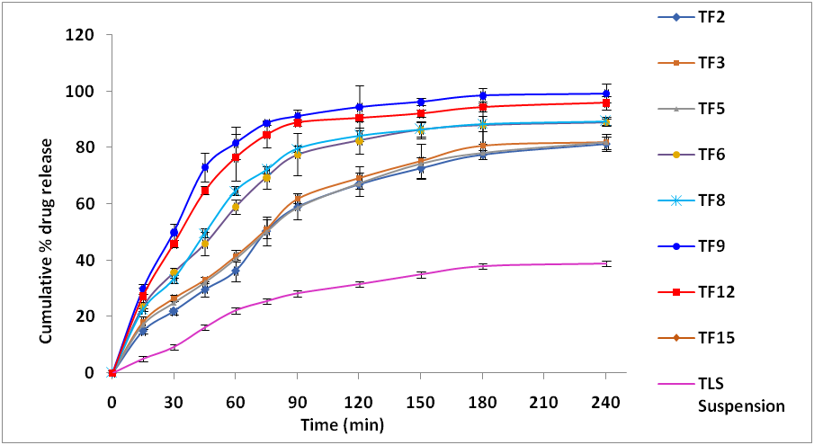 Methods: Self-Emulsifying Drug Delivery Systems (SEDDS) of TLS were formulated using cinnamon essential oil as the oil phase, Gelucire 44/14 as the surfactant and Transcutol HP as co-surfactant. Drug-excipient interactions were studied by FTIR spectroscopy. The formulations were evaluated for its self-emulsifying ability, clarity, and stability of the aqueous dispersion after 48 h and the phase diagram was constructed to optimize the system. Selected formulations were characterized in terms of droplet size distribution, zeta potential, cloud point and were subjected to in vitro drug release studies. The bioavailability of optimized formulation was assessed in New Zealand white rabbits.