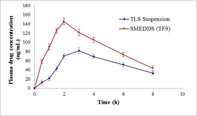 Results: By considering smaller droplet size, higher zeta potential and faster rate of drug release the formulation TF9 was chosen as optimized SMEDDS formulations. TF9 was robust to different pH media and dilution volumes, remained stable after three cooling-heating cycles and after stored at 4 °C and 25 °C for 3 mo without showing a significant change in droplet size. The pharmacokinetic study in rabbits showed SMEDDS have significantly increased the Cmax and area under the curve (AUC) of TLS compared to suspension (P<0.05).