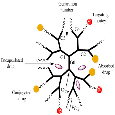 Dendrimers act as a carrier for the delivery of anti-cancer drugs by either encapsulation of the drug in the interior of the dendrimer or conjugating covalently to form macromolecular prodrug [27].