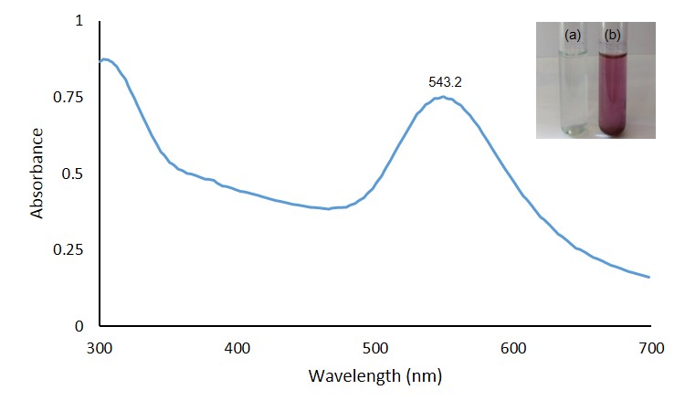 Fig. 1: UV-visible spectrum of AuNPs synthesized from the shells of Pistacia vera L. Inset shows biosynthesized AuNPs. (a) control (before synthesis), (b) test (after synthesis)